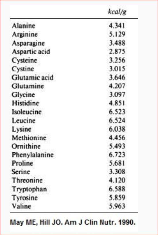 L’aspetto che probabilmente sorprenderà di più, in quanto meno noto è che ogni singolo aminoacido che compone la proteina detiene un valore calorico diverso rispetto all’intera proteina. Se le proteine infatti sono strutturate in un insieme di aminoacidi sia essenziali, sia non essenziali, le 4 kcal per ogni grammo rimangono un valore realistico. Alcuni aminoacidi tuttavia hanno un valore energetico inferiore rispetto a queste 4 kcal per grammo come la glicina e l’acido aspartico mentre gli aminoacidi come i ramificati, la lisina e il triptofano, hanno un potenziale calorico superiore. Questi ragionamenti risultano utili quando si assumono integratori di aminoacidi in grosse quantità per tracciare in maniera realistica l’esatta quota calorica introdotta.