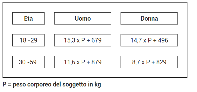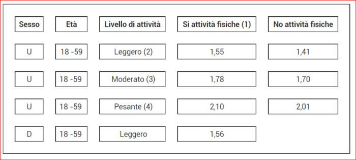 Concludiamo ricordando l’importanza di calcolare il proprio fabbisogno calorico in maniera da dosare al meglio l’integratore e regolarsi con l’alimentazione: il metabolismo basale e il proprio livello di attività fisica possono essere individuati con l’aiuto di uno specialista, ma per avere una visione d’insieme, il calcolo può essere effettuato osservando le indicazioni delle seguenti tabelle che distinguono gli atleti in base al sesso, alla fascia d’età e al livello di attività fisica svolta durante il giorno, considerando lo stile di vita più o meno sedentario.